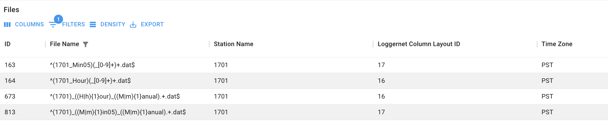 Station 1701 has 4 file patterns, 2 each for 5-minute and hourly data for automated and manual uploads. Add four new records, one at a time, copying the File Name column and changing "1701" to "1760" in the string. Choose 1760 from the station dropdown list, and set the Loggernet Column Layout ID and Time Zone to match.